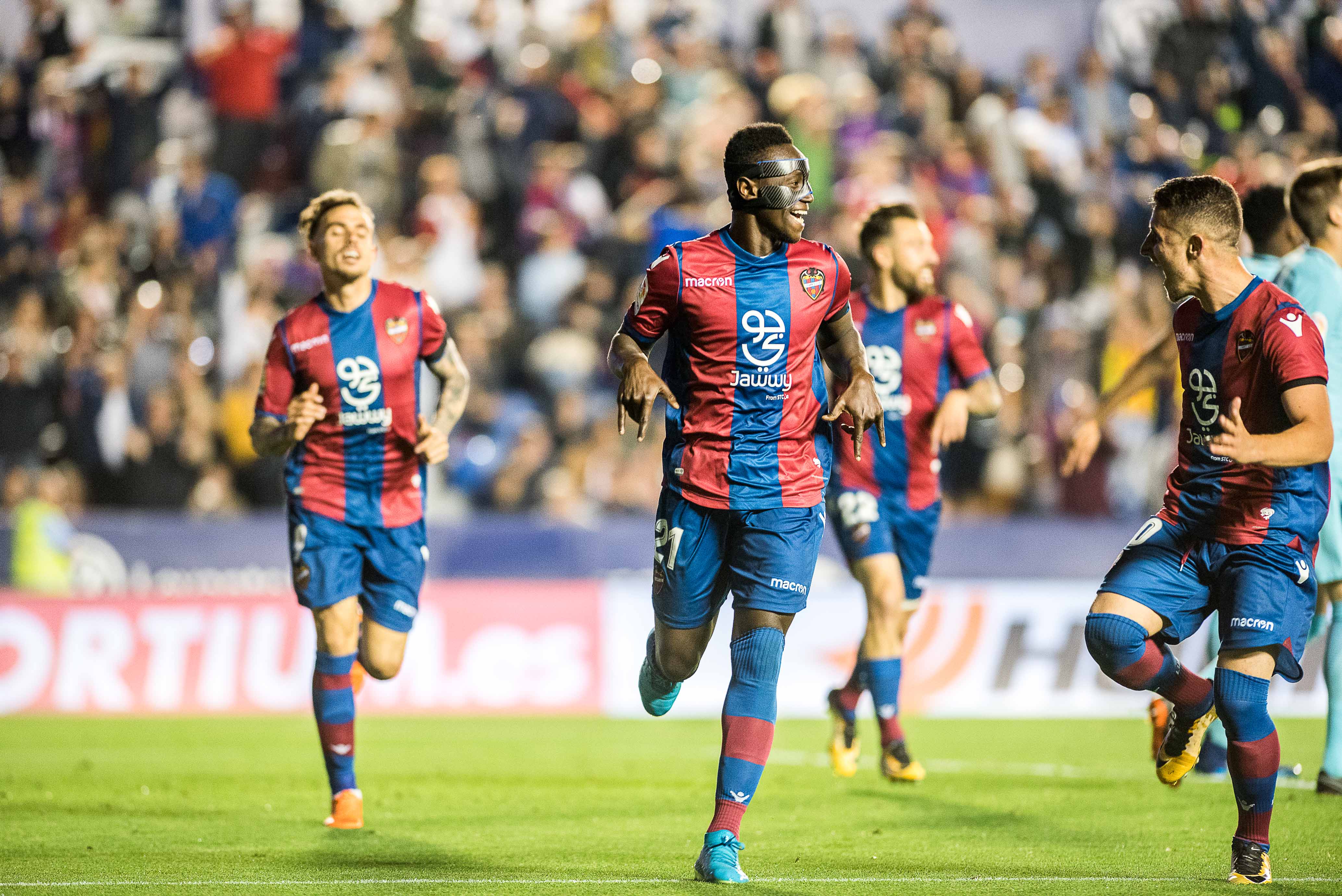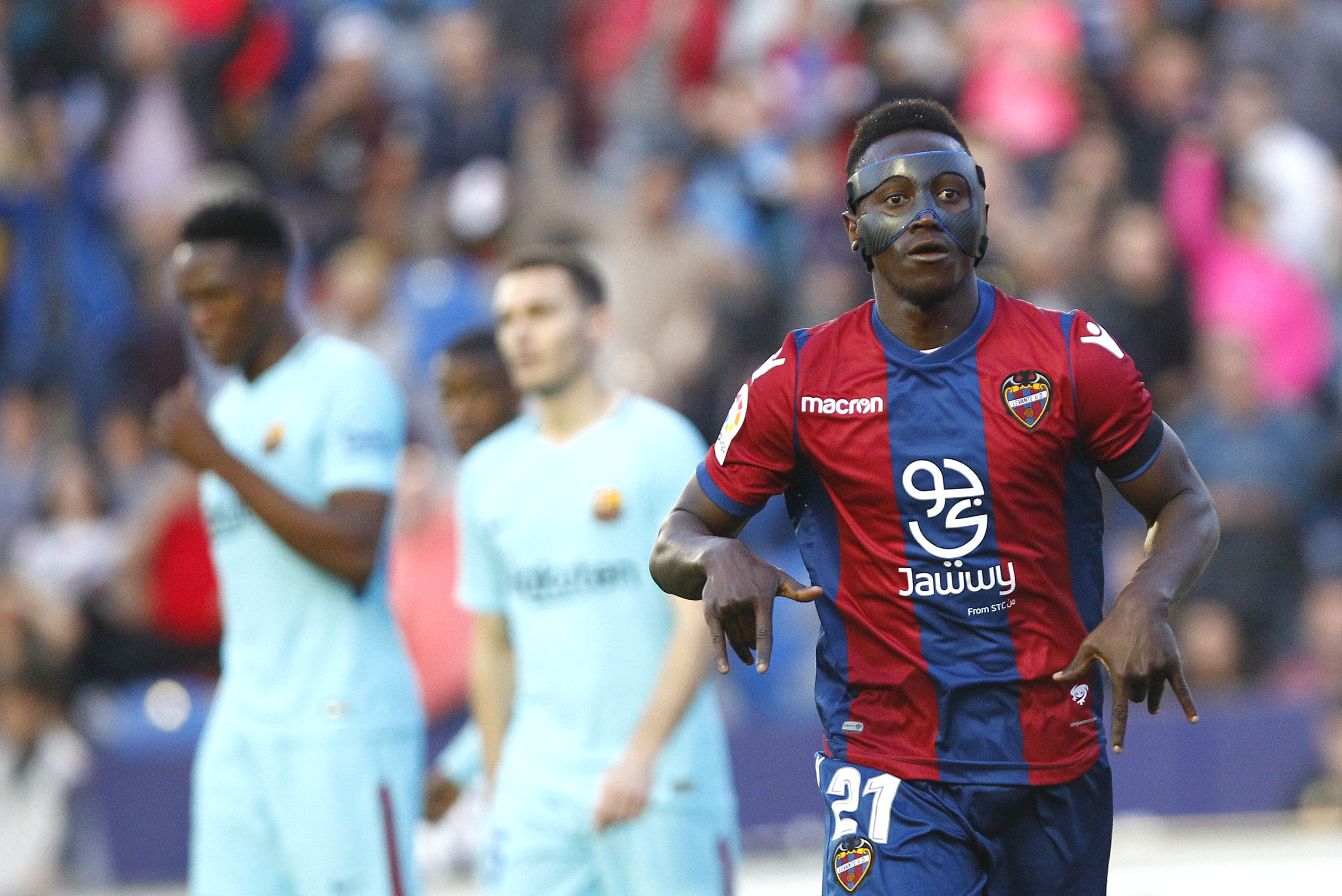 Emmanuel Boateng marchó del Ciutat de València con el balón amarrado entre sus brazos. Había capitalizado la confrontación. El atacante no se separó del esférico y posó con orgullo ante los medios en la zona mixta antes de abandonar el coliseo de Orriols. Fue una constante desde el final de la batalla. Era posiblemente el principal exponente de todo lo que había sucedido en el interior del verde. Boateng firmó su primer hat-trick como futbolista profesional. En su etapa anterior en Portugal, en las filas del Moreirense, acumuló dos dobletes en los compromisos ante el Arouca y Benfica. Boateng se exhibió ante el Barcelona en una especie de confirmación de la catarsis colectiva y personalizada manifestada por el Levante. El atacante celebró su primera convocatoria con al Selección Absoluta de Ghana con un triplete anotador. Fue un martirio constante para la meta defendida por Ter Stegen. Boa ha permutado su rol desde el aterrizaje de Paco López. Es una obviedad. Los goles refrendan esta reflexión. Eibar y Málaga fueron sus últimas victimas desde la conversión del técnico de Silla en preparador azulgrana. El delantero tomó el testigo de Rigano y Barral. Es el tercer hat-trick de la narración granota en la elite.