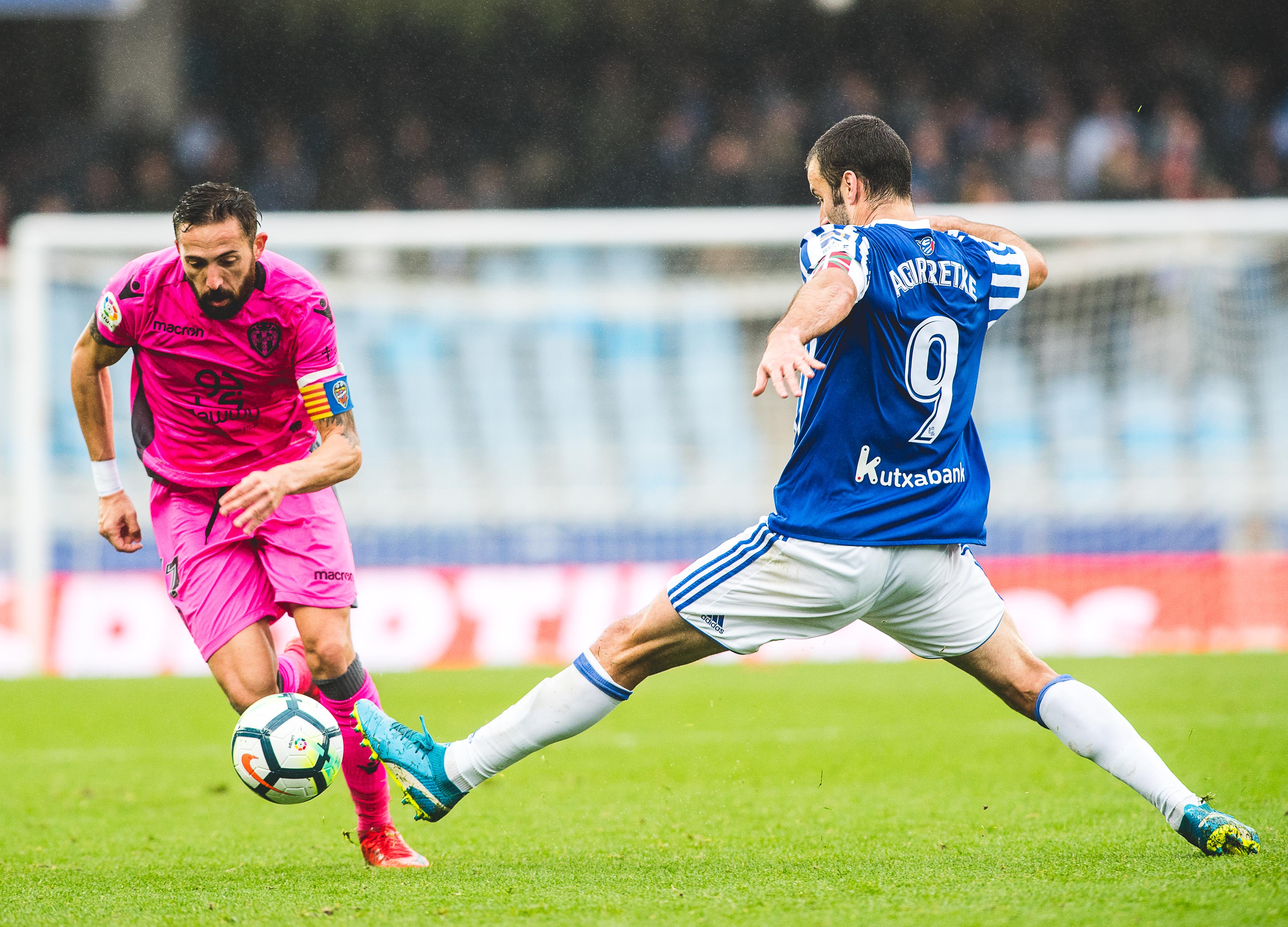 Sonaban tambores de guerra en el prólogo del partido que cruzó al Levante y a la Real Sociedad en Anoeta. El ruido fue perceptible en los minutos anteriores del arranque de la confrontación. El feudo guipozcoano expresó su malestar y su incorfomidad justo en el instante en el que los chicos de Eusebio Sacristán traspasaban esa frontera que distancia el verde de la superficie del vestuario; es un paso breve que distancia el cielo de la tierra. No obstante, los lamentos no fueron eternos. En apenas media hora las tornas habían cambiado. El aspecto resalta lo mudable que puede llegar a ser el fútbol. Al Levante no le dio tiempo material para recorrer los afluentes que conducen hacia el atrevimiento y la serenidad. A los ocho minutos Xabi Prieto desprecintaba la portería defendida por Oier. El tiempo puede convertirse en una secuencia difícil de manejar. Puede ser mortífero y temible o puede ser placentero. Los hechos se precipitaron tras la decisión adoptada por Jaime Latre. El colegiado castigó con pena máxima una acción protagonizada por Sasa Lukic en el interior del área azulgrana. El meta de Irún rozó la heroicidad en una estirada imponente. Adivinó las intenciones del cartesiano futbolista local, pero su disparo aunó potencia y veneno y chocó con violencia contra la red.