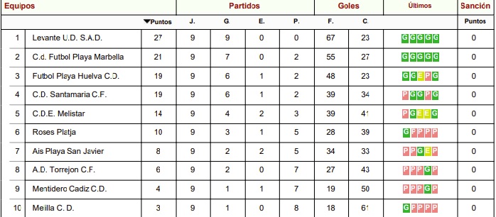 Pleno de victorias para Levante UD Fútbol Playa en la fase regular del Campeonato de España tras las nueve jornadas disputadas, las tres últimas en Torrox, lo que le permite finalizar la liga como líder destacado con 27 puntos, seis más que el segundo clasificado, el Playa Marbella.