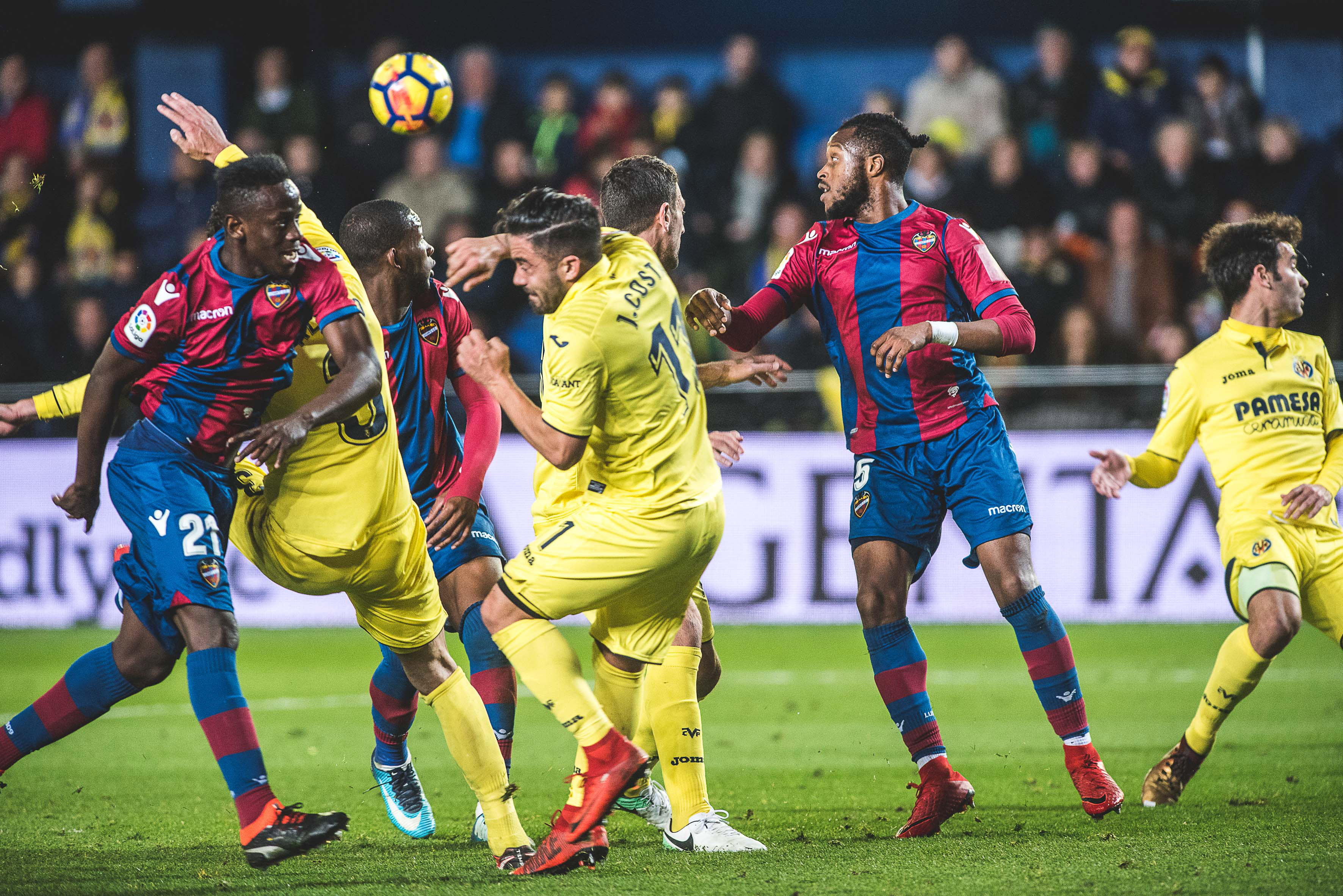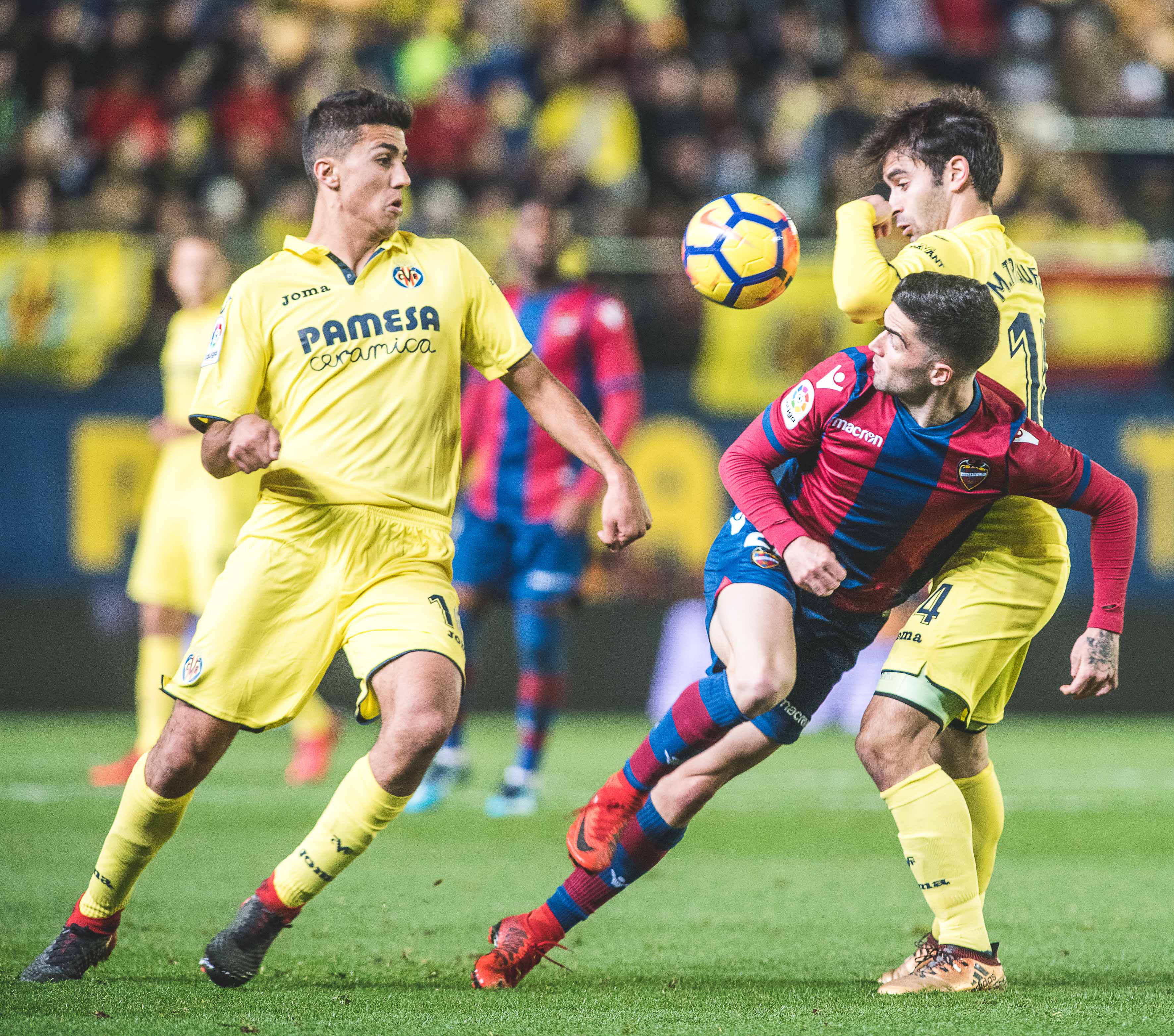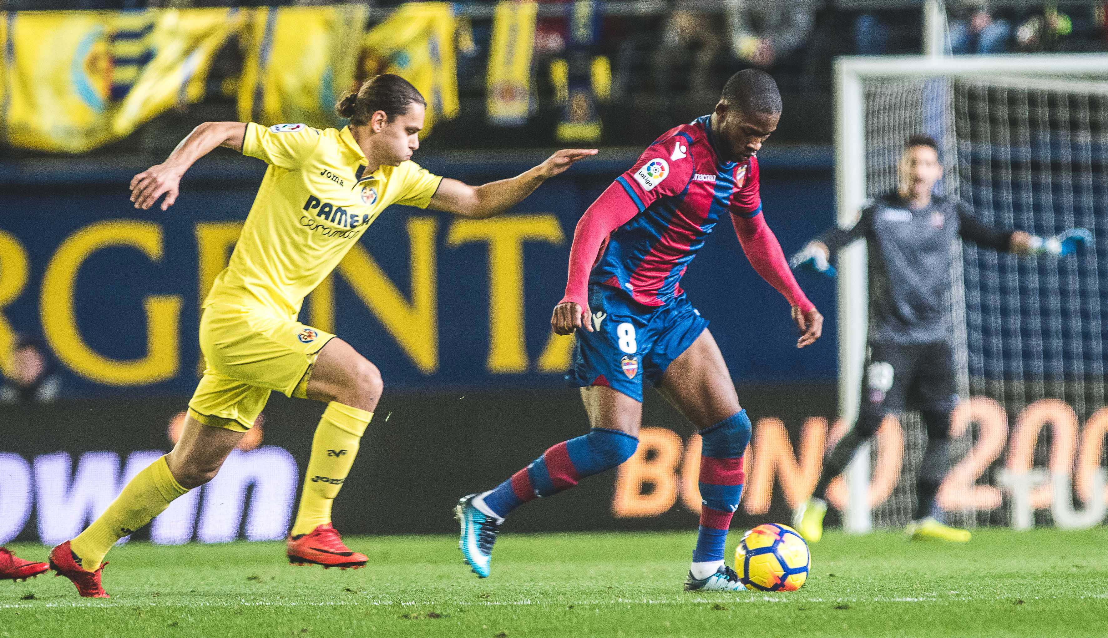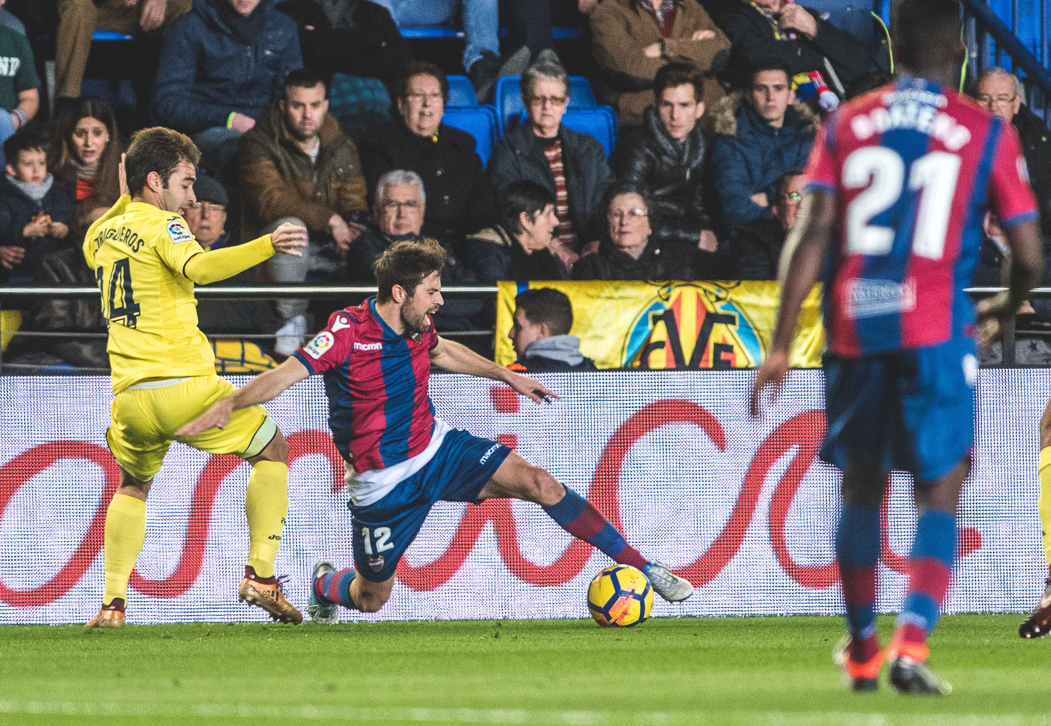 Pese a su condición de defensor no cejó en su empeño de recorrer la banda con el fin de convertirse en un atacante más. Por la orilla contraria de la superficie del verde, Morales percutía sobre su oponente. Fueron los momentos más determinantes del Levante. El bloque granota se desprendió del corsé que le atenazaba para desafiar al Villarreal. El Comandante pisó el área amarilla con regularidad en los minutos finales del primer acto. Y Postigo probó los guantes de Asenjo en un disparo desde las cercanías del perímetro defensivo del Submarino. El Levante presentaba argumentos para soñar con un cambio en el guion de la confrontación. No obstante, la puesta en acción del Villarreal en la epifanía de la reanudación cortó cualquier atisbo de metamorfosis. Ünal recorrió la banda izquierda como extremo para contactar con Cheryshev. El partido se quebró. El gol de Roger, con el duelo ya con la persiana echada, fue prácticamente testimonial.