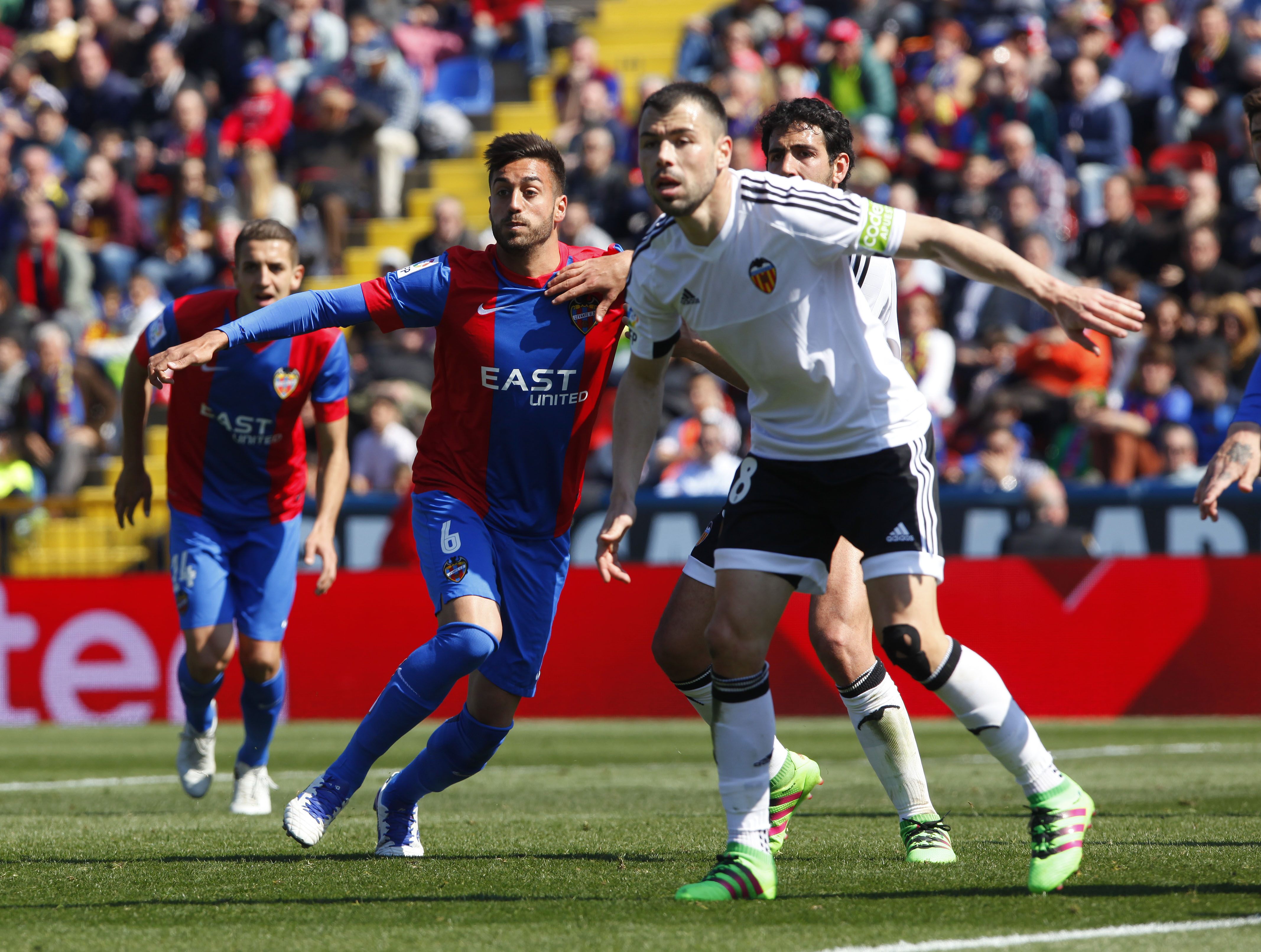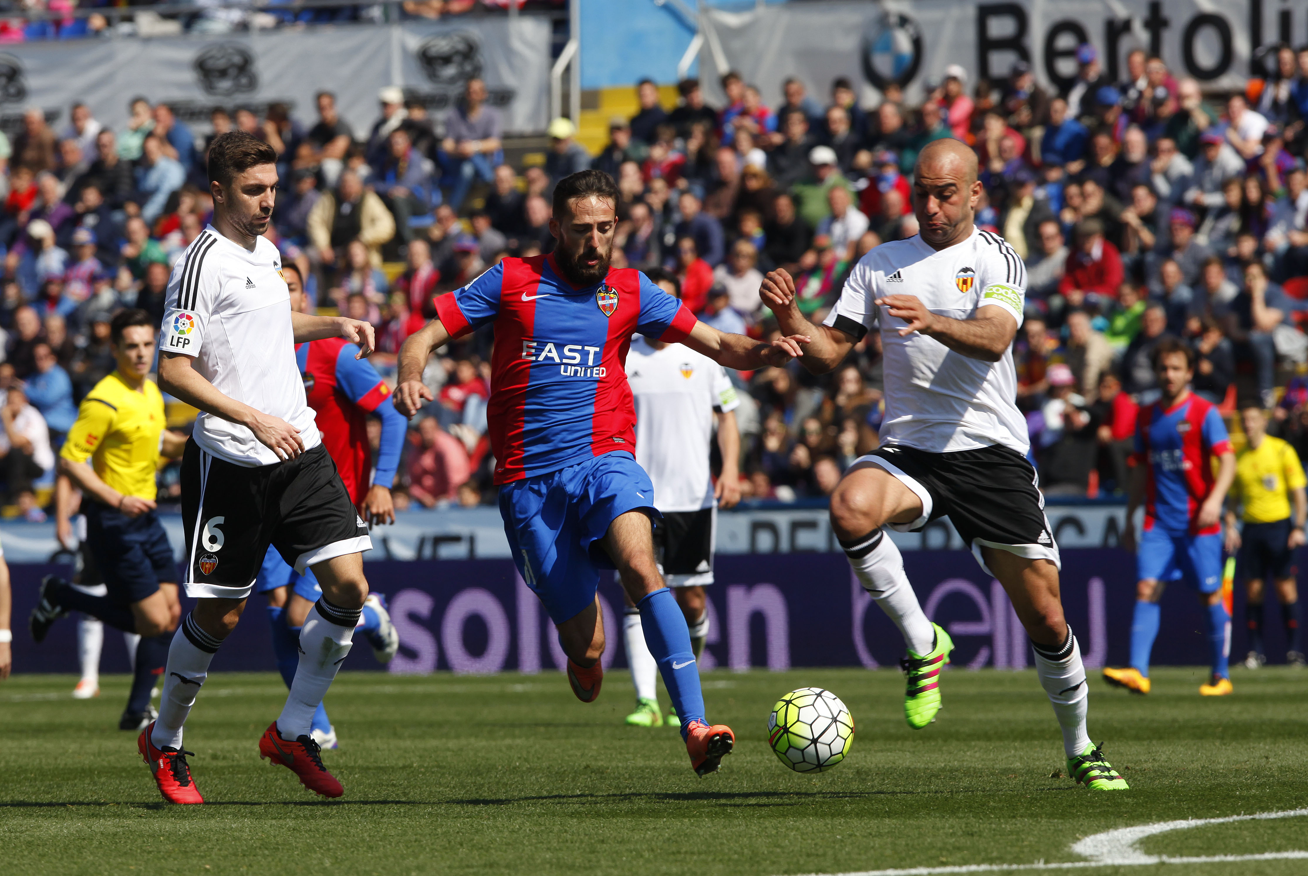 La enchufó Giuseppe Rossi ante su adversario preferido en el ámbito de la Liga BBVA en una de las ocasiones de mayor complejidad. El italiano mostró sus argumentos cuando lo balones caen por el interior del área rival. En ese espacio se muestra letal. Sus botas son inmisericordes en ese punto del terreno de juego y también cuando se topa con la escuadra blanquinegra. Lo hizo en su estancia en el Vilarreal y lo repitió en el derbi de la capital del Turia. Rossi embocó un saque de banda made in Juanfran que más parecía un saque de esquina. Se trata de una de las especialidades del capitán. Lo saben sus compañeros. Deyverson realizó una emboscada en la que cayeron los defensores foráneos. La maniobra de distracción dio los réditos que se esperaban. El italiano no desaprovechó la ocasión para batir a Alves y consignar un triunfo necesario, merecido y sumamente esperado por parroquia granota ante el simbolismo que encarna vencer al equipo de Mestalla. El Levante lanzó un mensaje en dirección a la Liga BBVA y a sus rivales directos en la encarnizada batalla por la supervivencia en la elite. No está dispuesto ni a claudicar, ni tampoco a descabalgarse. El esfuerzo y el camino se presuponen de una dificultad tan terrorífica como terrible, pero hay complicidad y compromiso para afrontar un reto de dimensiones considerables.